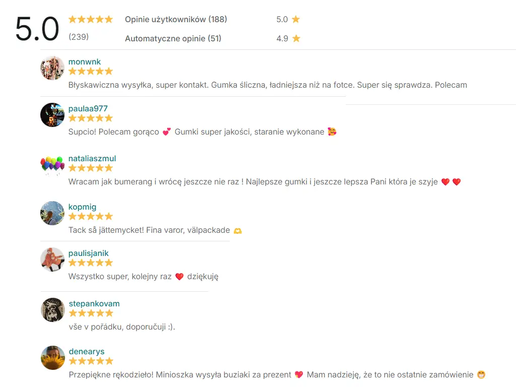 Dołącz do grona zadowolonych klientów z różnych zakątków świata, którzy pokochali nasze jedwabne gumki do włosów! Przeczytaj, co mówią o ich jakości, komforcie noszenia i wpływie na kondycję włosów. Ich opinie są dla nas niezwykle cenne i motywują nas do dalszego tworzenia produktów, które spełniają oczekiwania nawet najbardziej wymagających osób. Wielu z nich wraca do nas po kolejne gumki, co jest dla nas największym dowodem uznania.